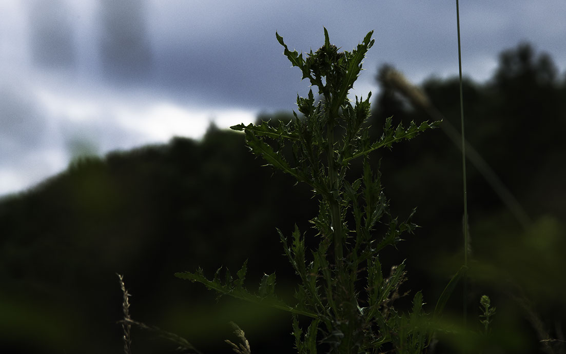 Distel vor Wald und Wolken